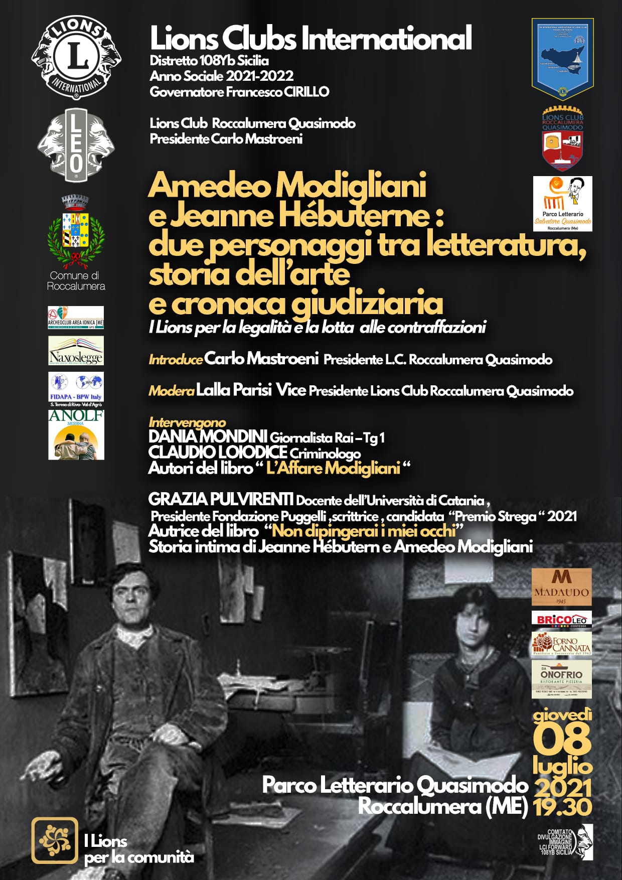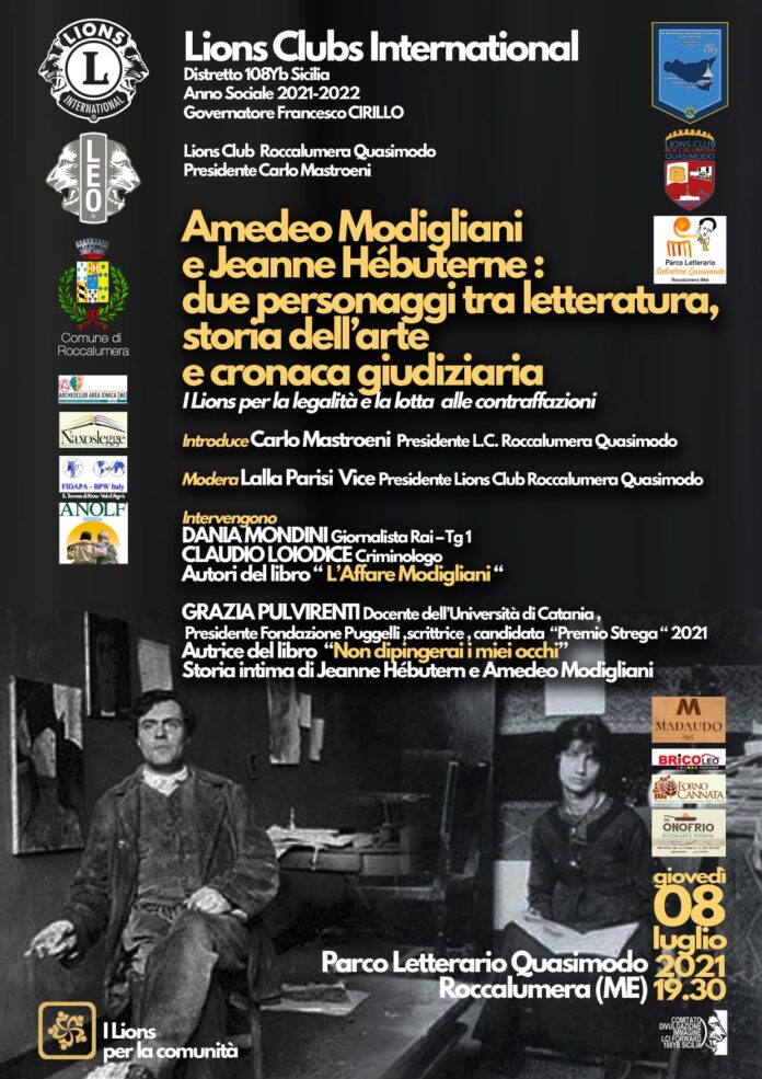 Roccalumera – Si svolgerà l’8 luglio presso il Parco Letterario Salvatore Quasimodo, l’evento dal titolo “Amedeo Modigliani e Jeanne Hébuterne: due personaggi tra letteratura, storia dell’arte e cronaca giudiziaria”, organizzato dal Lions Club Roccalumera Quasimodo, presieduto da Carlo Mastroeni,  in collaborazione con il Comune di Roccalumera , La Fidapa sez. Santa Teresa Valled’Agrò , Anolf Messina , Archeoclub d’Italia sez. Area Jonica Messina ed il Leo Club Santa Teresa di Riva