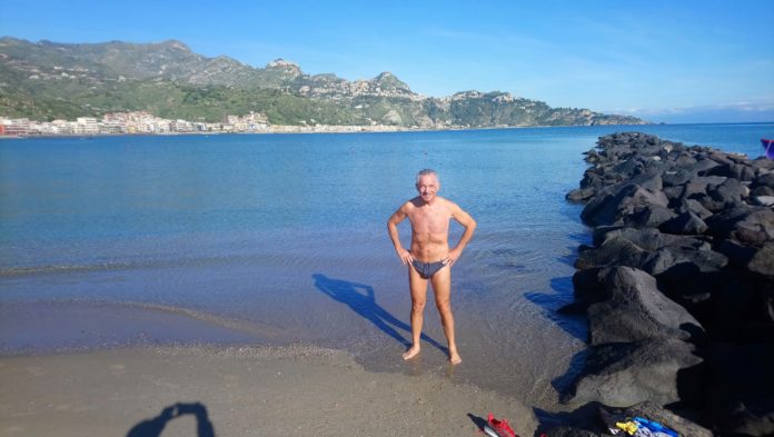 Taormina – Bagno natalizio per l'”iron man”, Salvatore Ferrara. Nelle acque calde e cristalline di Schisò, a Giardini Naxos, sullo sfondo del panorama di una Taormina baciata dai raggi del sole, Ferrara, si è tuffato nelle acque di un mare calmissimo. “È stata un’ esperienza bellissima – ha detto Ferrara, erede ideale dello scalatore dei grattacieli, Chico Scimone – questo testimonia, ancora una volta che basta poco e le nostre zone si trasformano in un autentico paradiso”. Ferrara si sta preparando per la scalata di un edificio a Latina e non è escluso possa partecipare alla scalata dell’Empire State building di New York, gara tanto amata, appunto, dallo scomparso Chico.