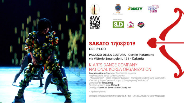 Catania – (Di redazione) Un evento d’eccezione fuori programma che viene offerto al capoluogo etneo grazie alla collaborazione tra WonderTime e Taormina Opera Stars che dal 18 al 25 agosto terrà al Teatro Antico di Taormina la sua 5° edizione del Festival della Musica Classica. Sabato 17 agosto alle ore 21 al Cortile Platamone del Palazzo della Cultura di Catania si esibirà in uno spettacolo di danza contemporanea una delle compagnie più prestigiose al mondo, la K-Arts Company Dance. Ingresso gratuito.